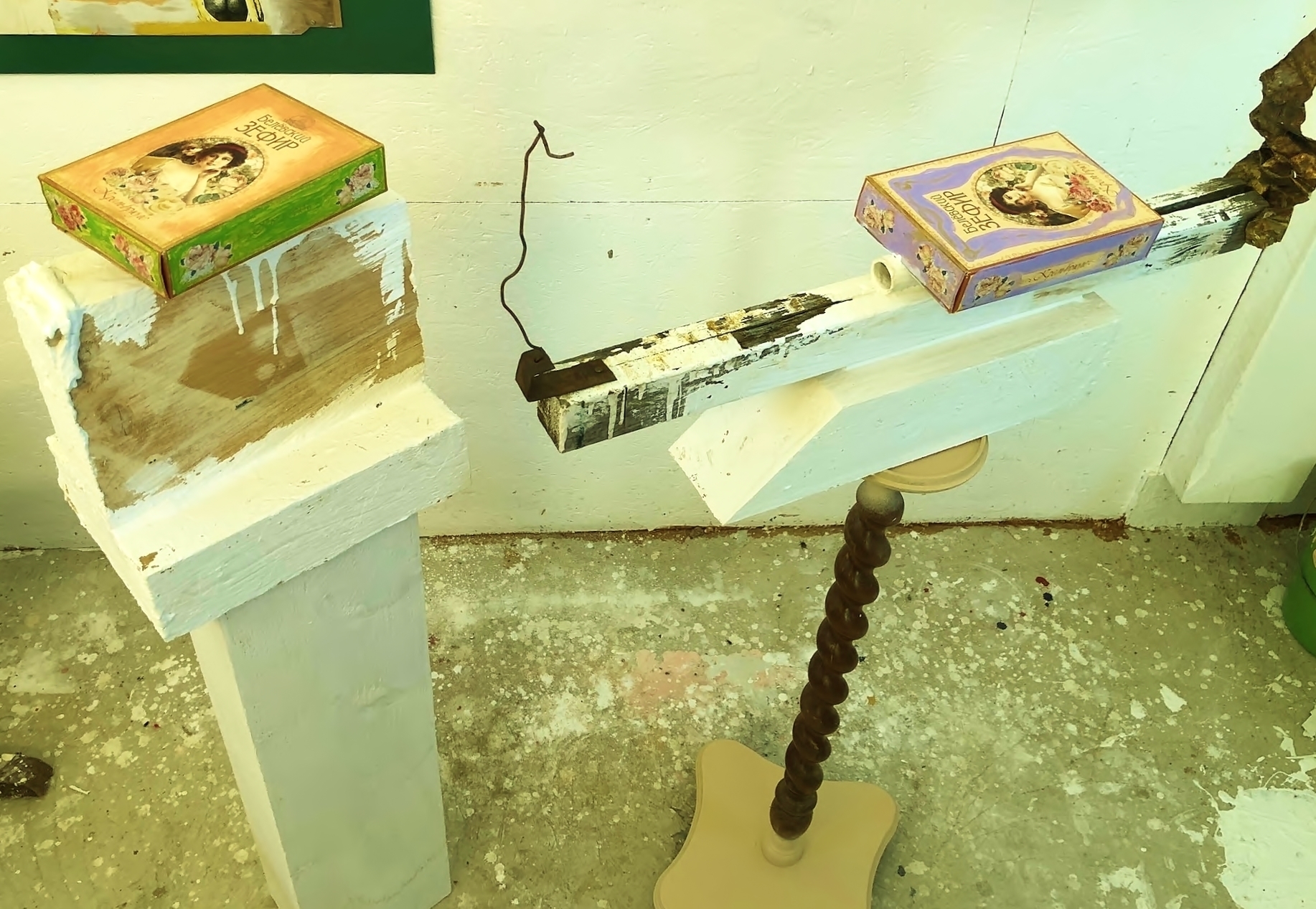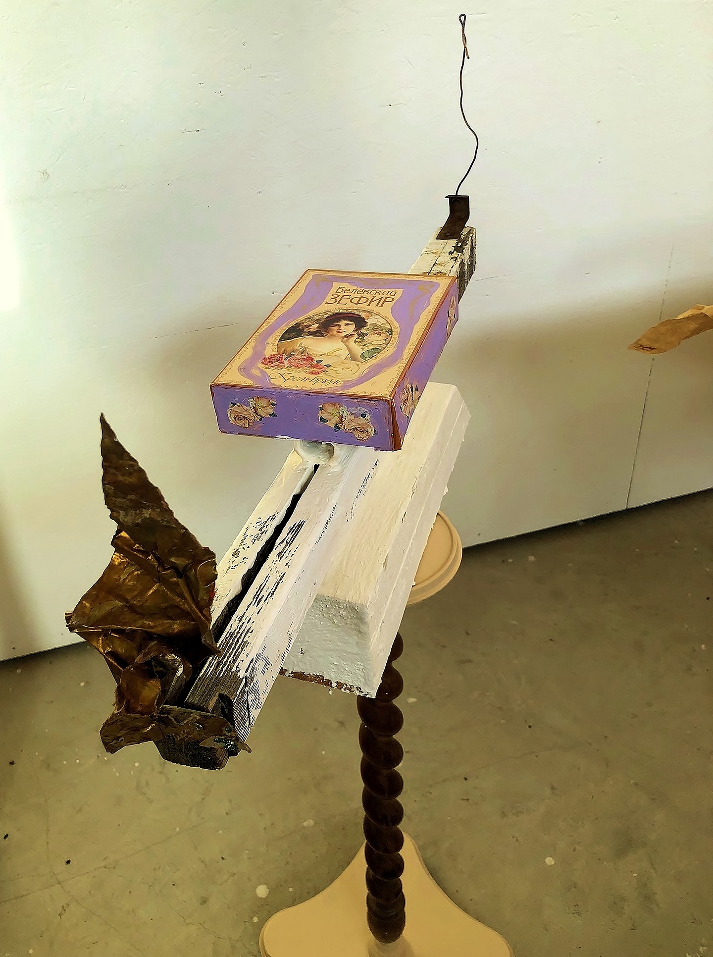 "Sweets from Vienna", 2026, cardboard, paper, paint, wood, cooper, iron, wire