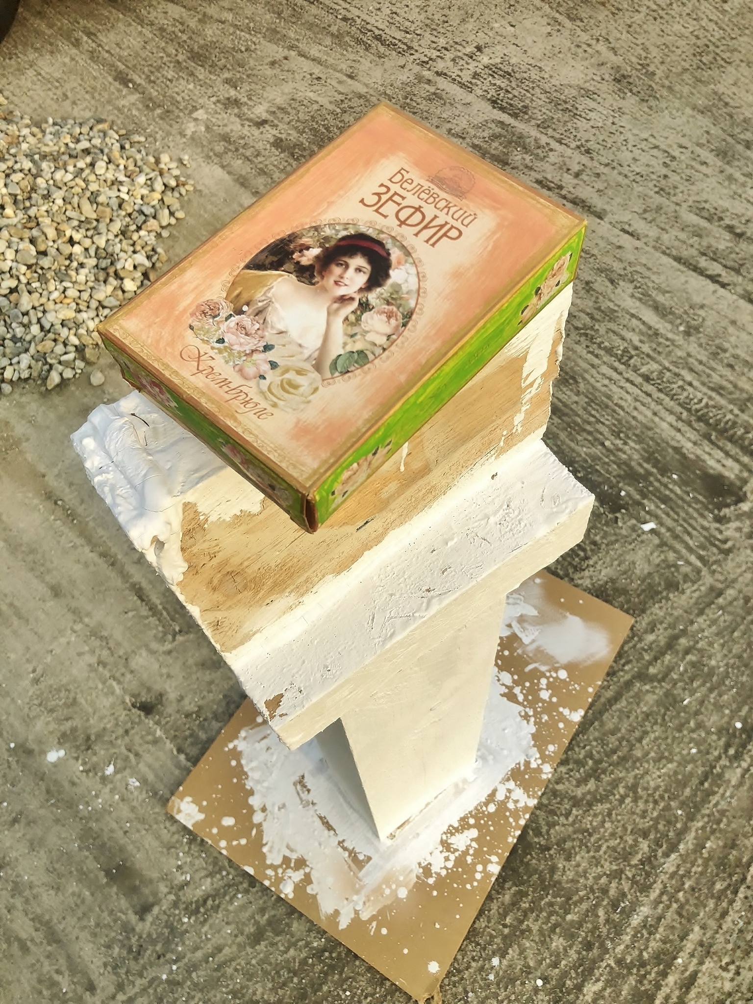 "Sweets from Vienna", 2026, cardboard, paper, paint, wood, cooper, iron, wire