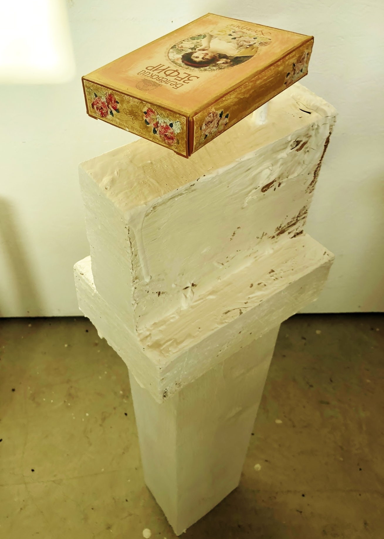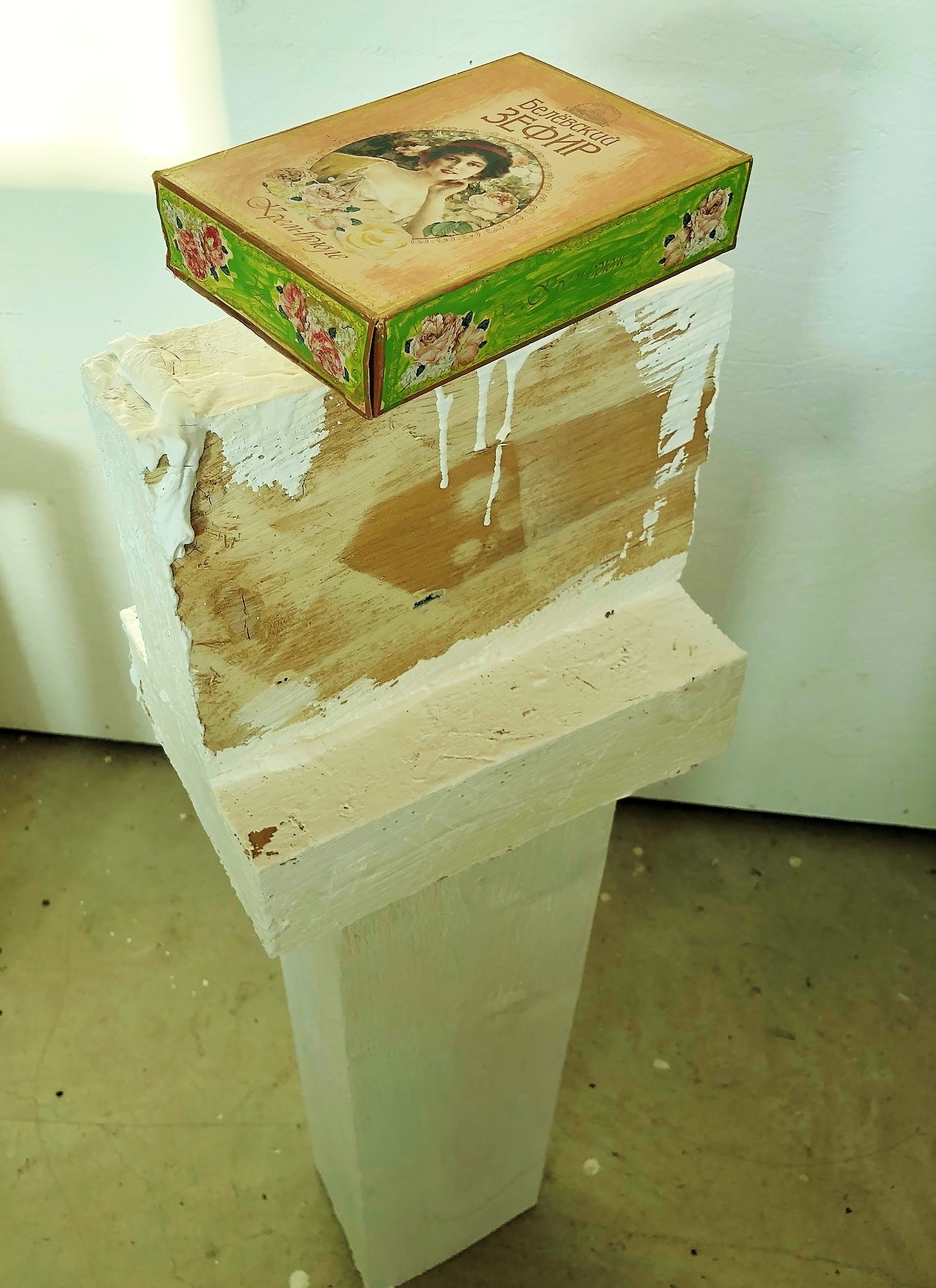 "Sweets from Vienna", 2026, cardboard, paper, paint, wood, cooper, iron, wire